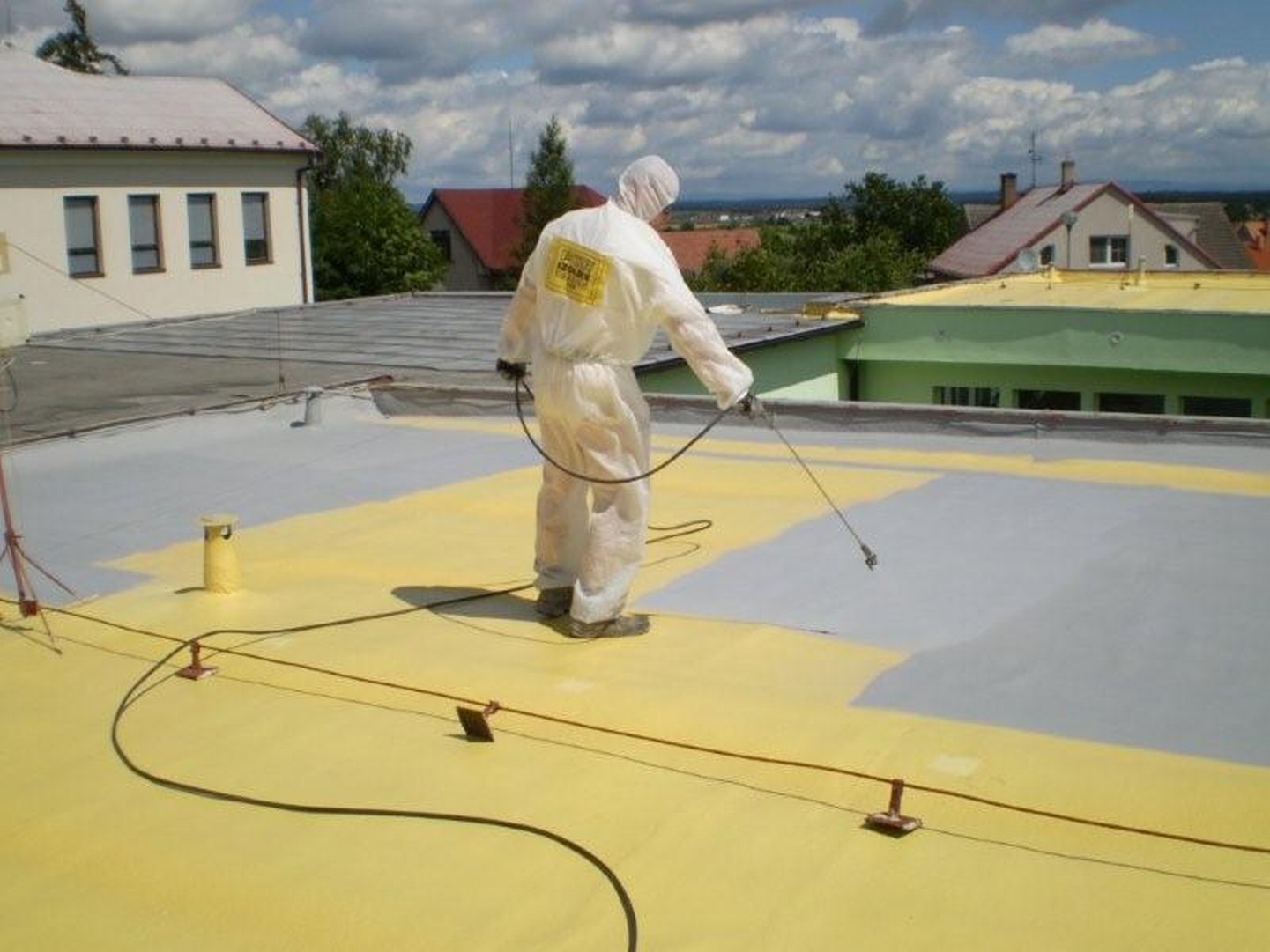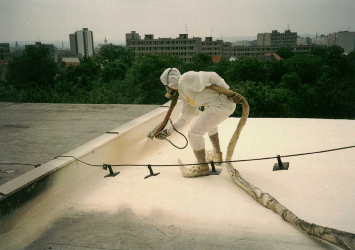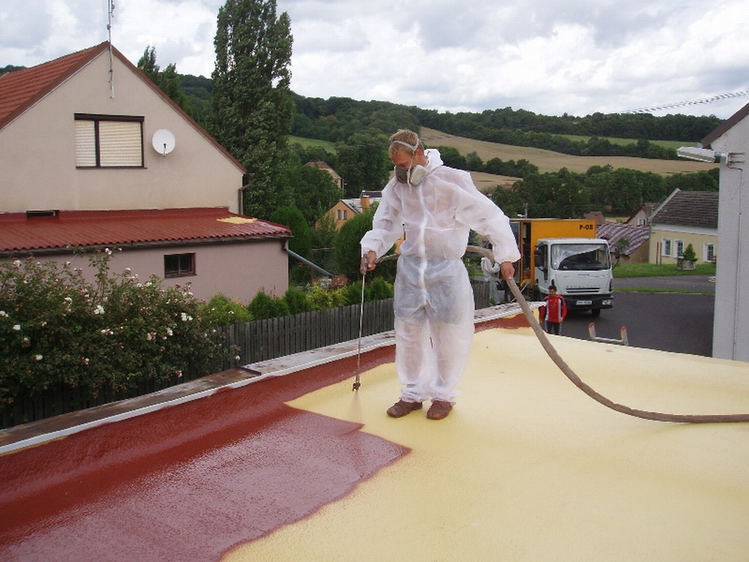 "A poliuretán keményhab hőszigetelések az építkezésen permetezve száraz felületen legalább 2°-os vagy annál nagyobb lejtésű tetőkre alkalmazhatók. Ha rendelkeznek vízszigetelő védőréteggel, kisebb lejtésen is alkalmazhatók. A poliuretán hab alkalmazási felületének legnagyobb lejtését nem határozzák meg. Ezt a védőréteg anyagának használata határozza meg. A tervezés és a kivitelezés részleteit a beszállítók különleges előírásai tartalmazzák."