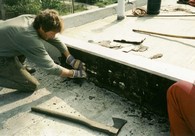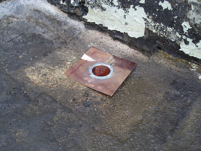 | Az alapfelülete kijavítása, a fellazult réteg eltávolítása, a dudorok kiszárítása és visszaolvasztása | A tetőelfolyók betétkialakítása réz betétekkel |